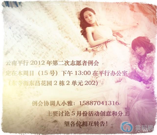 云南平行2012年第二次志愿者例会定在本周日(15号)下午13:00在平行办公室(东寺街东昌花园2栋2单元202)