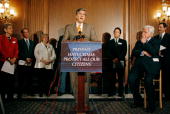 (本文图片为4月12日Judy Shepard在美国国会与参议员肯尼迪等人一起出席新的反仇恨犯罪法案的发布仪式)。