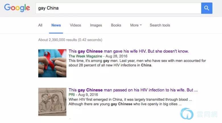 这几周谷歌搜索Gay China的前几条:《一个被染艾滋却不知情的中国同妻》